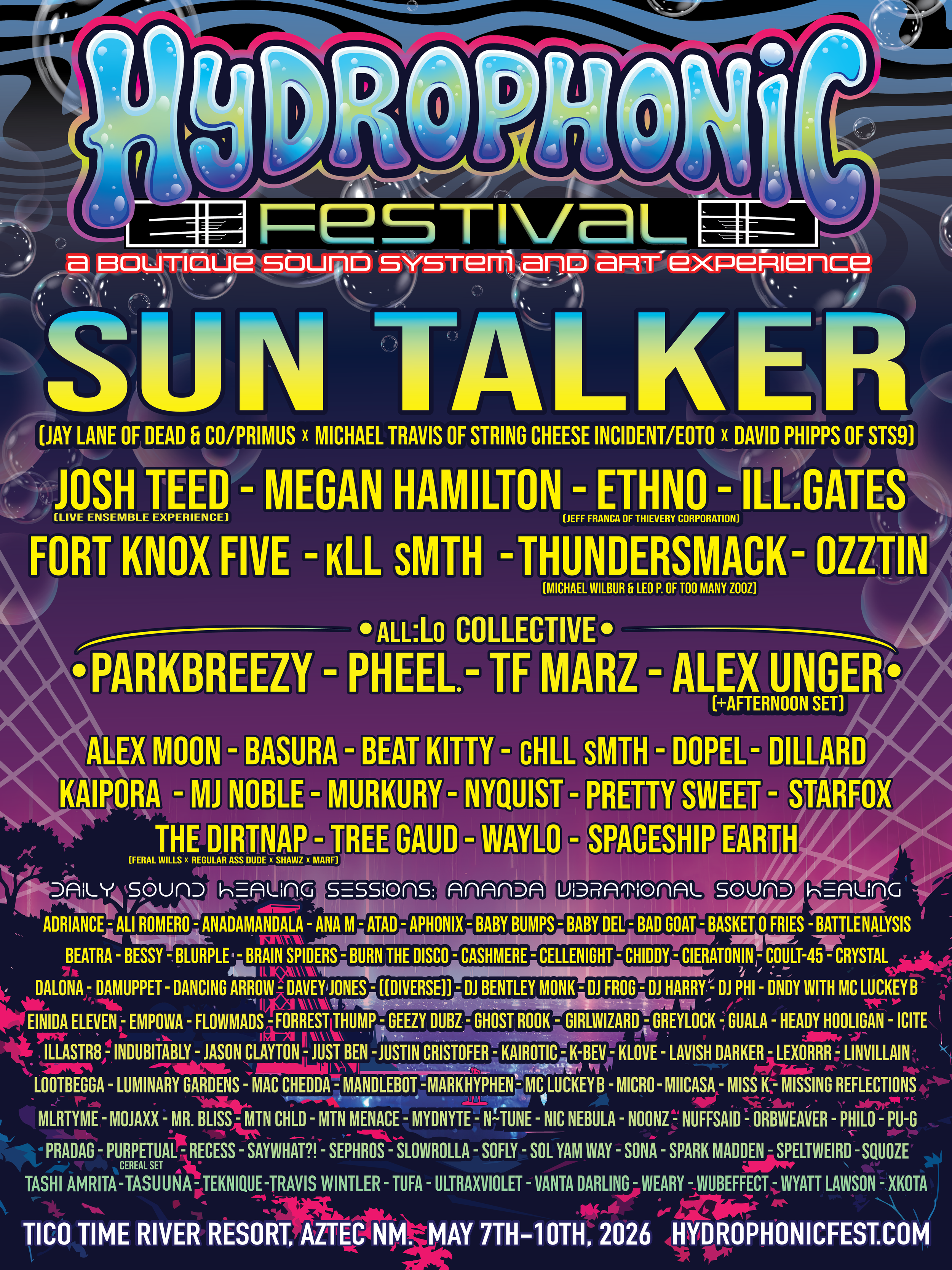 Hydrophonic Festival feat. Sun Talker, kLL sMTH, parkbreezy, pheel., TF Marz, Alex Unger, & more @ Tico Time River Resort - Aztec, NM Thursday, May 7, 2026 8:00 PM Sunday, May 10, 2026 11:59 PM Tico Time River Resort 3 Road 2050 Aztec, NM, 87410 United States (map) Google Calendar ICS TICKETS • RSVP • MORE INFO A Boutique Sound System Festival May 7-10 at Tico Time Resort on the Animas River between Durango, CO & Aztec, NM. Flow Arts Retreat, DJ/Producer Retreat, Workshops, and so much morewww.hydrophonicfest.com