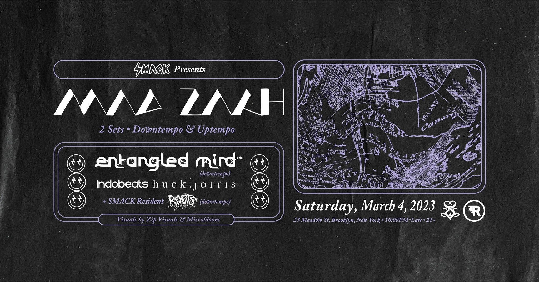 In-demand beatsmith Entangled Mind lends their considerable talents to this lineup with a keenly composed downtempo offering of their own courtesy of our friends from The Rust. SMACK Resident Roots is ready to flex his considerable range with a downtempo performance not to be missed.